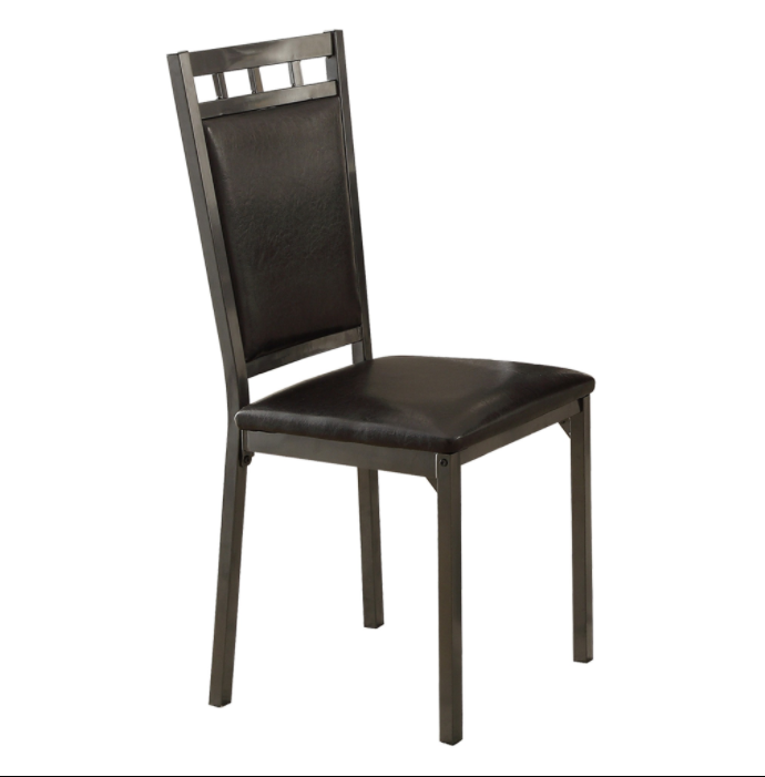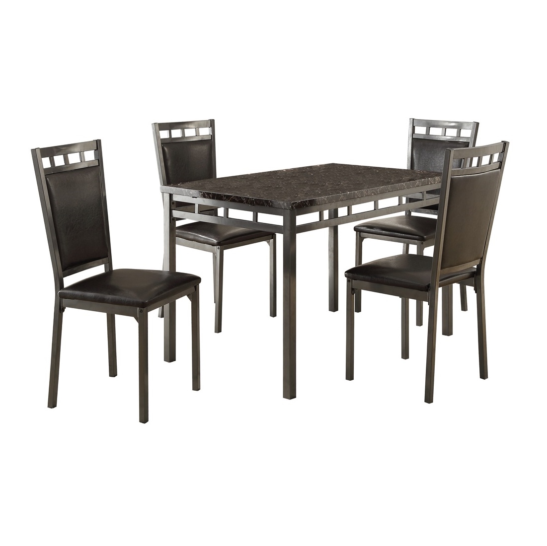 Designed for your modest dining space, the Olney Collection provides a stylish and functional surface for your mealtime needs. The 5-piece packed group features a metal table base that rises to support the traditional dining height, faux marble tabletop. Vertical accents grace the table apron and the top rails of the dark brown faux leather covered chairs.