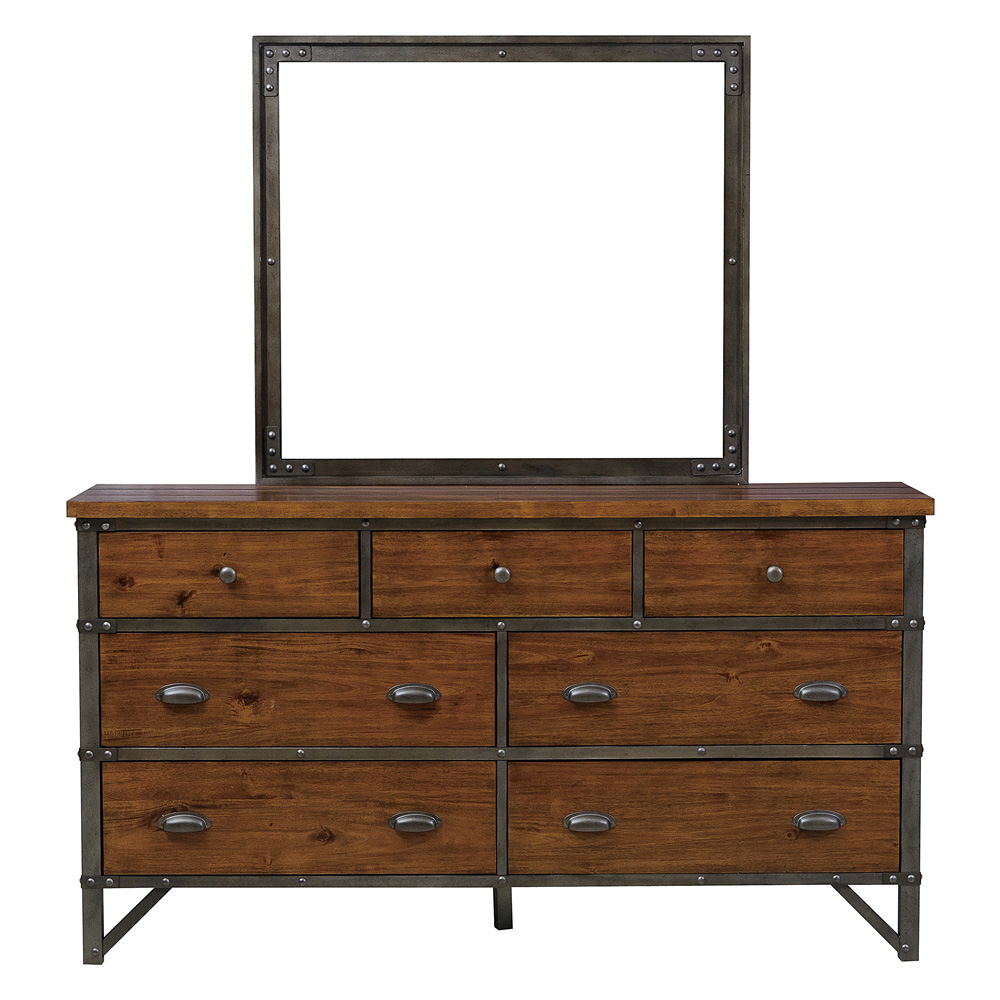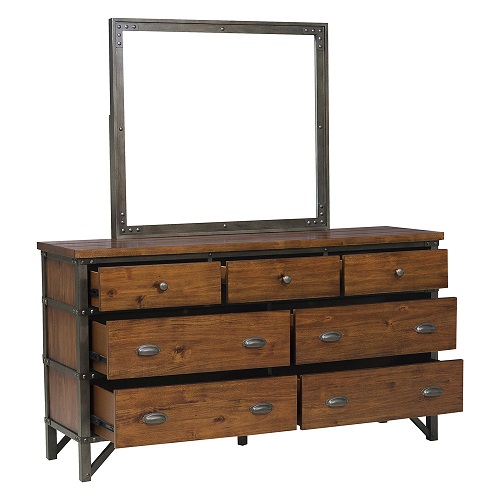Heavily influenced by industrial design, the Holverson Collection will lend a unique look to your personal space. Gunmetal finished wood framing provides sturdy structure and profile to the dresser. Faux rivets provide additional detail to the metal finished bracketing that is prominently on display. A rustic brown milk crate finish is utilized to highlight the acacia veneer with cup hardware providing complementing contrast to the wood’s natural look.
