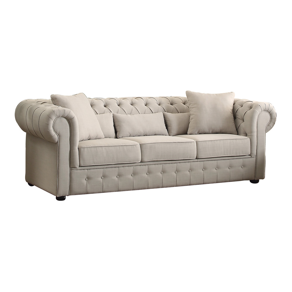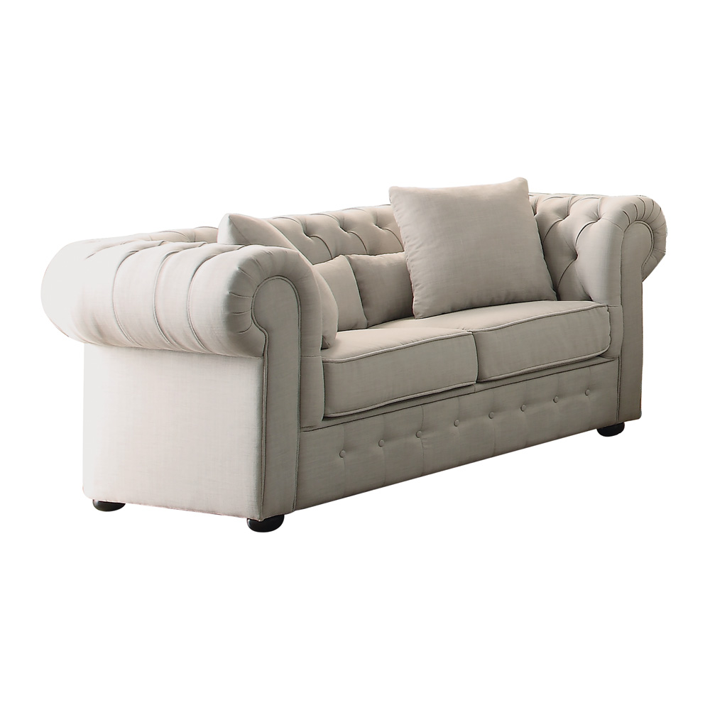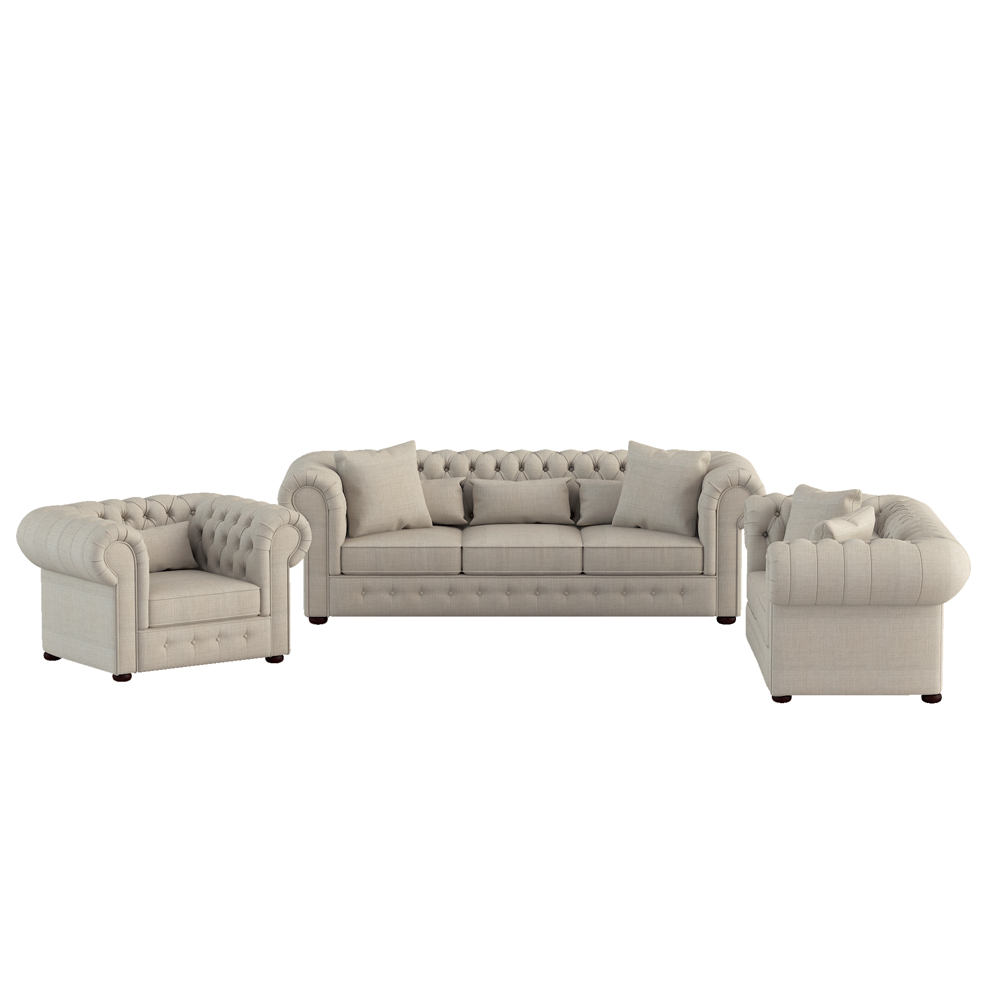 With a design that is driven by trend and style, the classic look of the Savonburg Collection blends with a number of modern and traditional settings. This Chesterfield style seating group is offered in neutral tone fabric and features button tufting and a heavily rolled arm that transitions to encompass the entire back of each piece in the collection. The substantial size of this offering allows for maximum comfort that is enhanced by the accompanying toss pillows.