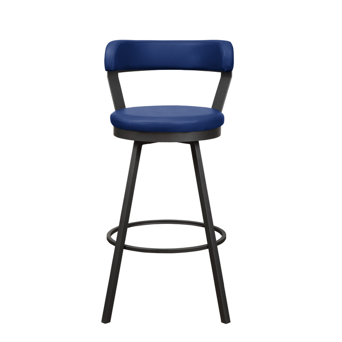 Perfectly styled for your casual dining space is the Appert Collection. This 24-inch counter height chair offering features a dark gray metal base that serves to support the blue faux leather round swivel seat. Allowing for perfect placement within your space, the Appert Collection is offered in a 29-inch pub height and 6 additional colors – black. brown, gray, dark gray, red and white.